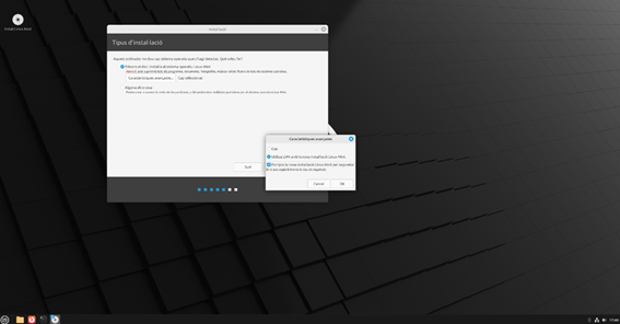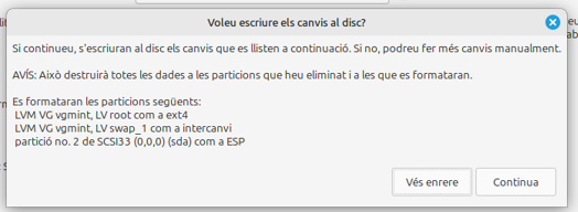 Ara ve un pas important, . Si fem una instal·lació neta, podem esborrar tot el contingut del disc. I si piquem al botó de característiques avançades, ens apareixen dues opcions que jo trobo molt interessants. Una és fer servir LVM (volums lògics) i l’altra és encriptar el disc. La primera facilita molt la vida quan el disc se’ns queda petit i volem afegir més espai sense que canviïn gaires coses al sistema. I la segona protegeix la nostra informació si, malauradament, algú accedeix físicament al nostre disc.
