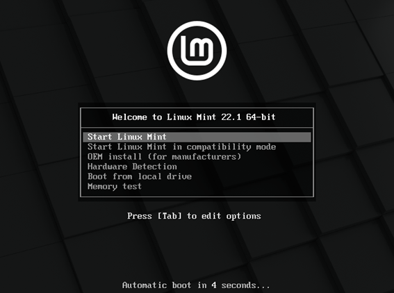 I ara una guia pas a pas de la instal·lació. No té cap misteri, però si és la primera vegada que instal·lem un sistema Linux sempre s’agraeix. Linux Mint facilita molt la vida d’ençà que comença la instal·lació, amb una primera pantalla on podem seleccionar si arrencar el sistema directament des del DVD o USB (life) o executar diferents tests de maquinari. Pel nostre propòsit, triem l’opció per defecte, que és arrencar la life del sistema: